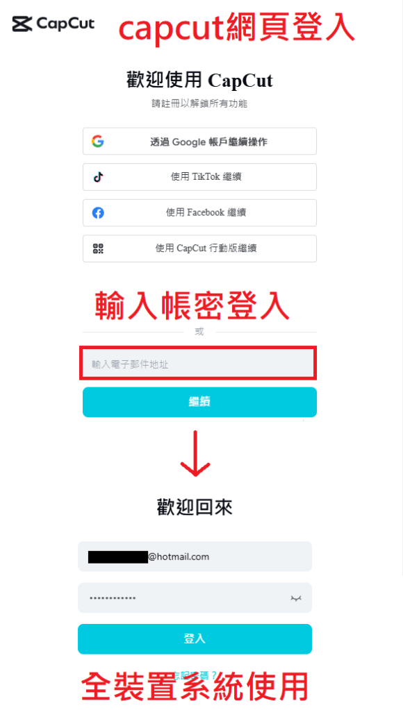 ⚠️ 到Capcut登入頁面按忘記密碼,到信箱收驗證碼,把Capucut登入密碼改成您的。